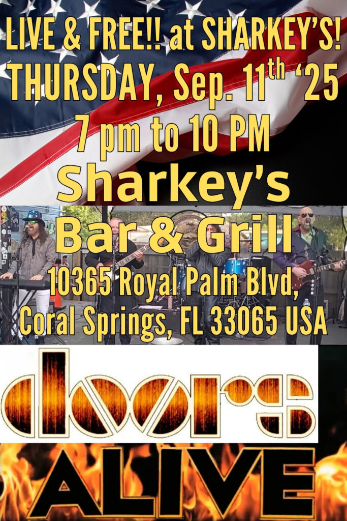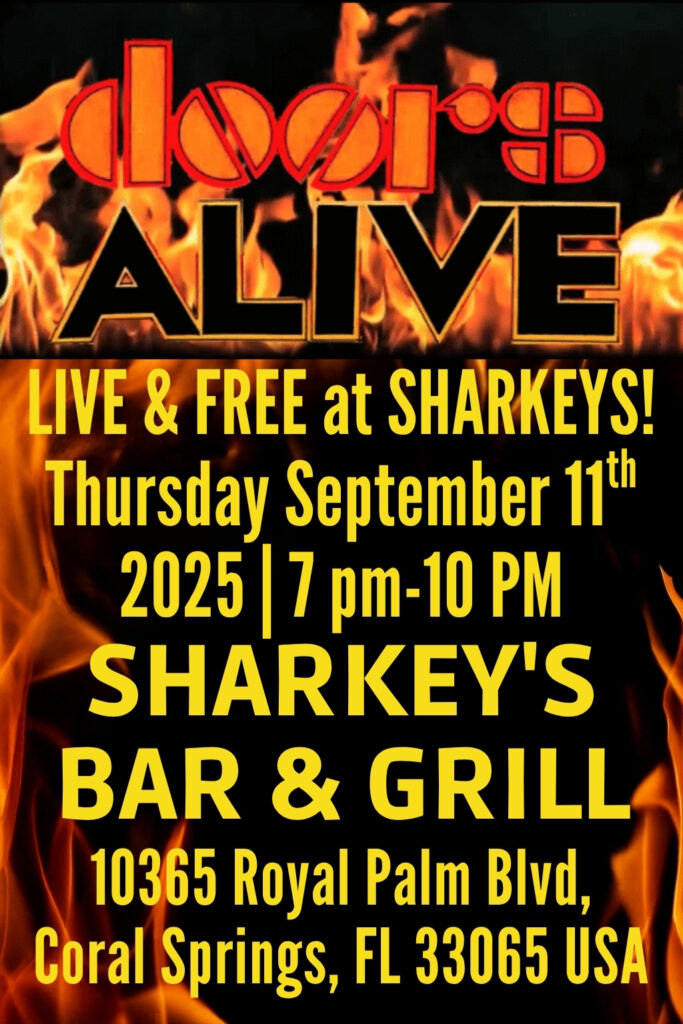 🎤 DOORS ALIVE – LIVE at Sharkey’s Bar & Grill!🗓️ Thursday, September 11th, 2026 | 7 PM – 10 PM📍 10365 Royal Palm Blvd, Coral Springs, FL 33065 USA💥 ADMISSION: FREE!! (Yes, really.)